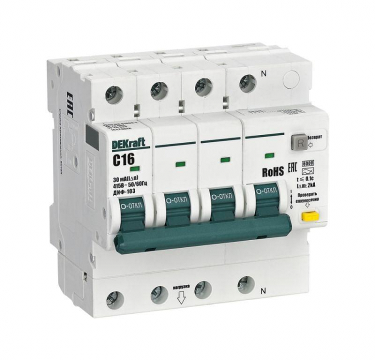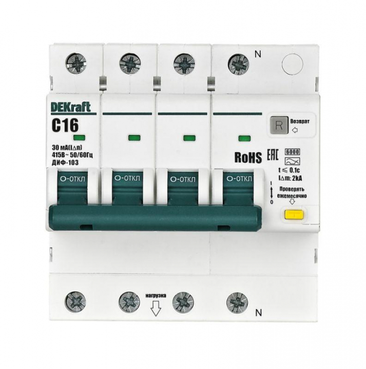 Автоматические выключатели дифференциального тока серии ДИФ-103 6кА NEW Dekraft; 3P+N; номинальный ток 16 А; ном. диф. ток 30 мА; тип диф. расцепителя - A; кривая отключения - С; Icn, Ics = 6 кА; тип устройства - электронный; монтаж – на DIN-рейку. АВДТ обеспечивают три вида защиты — от короткого замыкания, перегрузки и возникновения утечки тока (в частности, вследствие прикосновения человека к токоведущим частям). АВДТ с отключающей способностью 6кА применяются во вводно-распределительных устройствах (ВРУ), главных распределительных щитах (ГРЩ), осветительных и распределительных установках в общественных, административных, производственных, промышленных и других подобных зданиях.