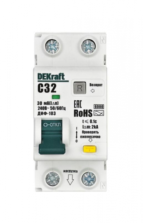 Автоматические выключатели дифференциального тока серии ДИФ-103 6кА NEW Dekraft; 1P+N; номинальный ток 32 А; ном. диф. ток 30 мА; тип диф. расцепителя - AC; кривая отключения - С; Icn, Ics = 6 кА; тип устройства - электронный; монтаж – на DIN-рейку. АВДТ обеспечивают три вида защиты — от короткого замыкания, перегрузки и возникновения утечки тока (в частности, вследствие прикосновения человека к токоведущим частям). АВДТ с отключающей способностью 6кА применяются во вводно-распределительных устройствах (ВРУ), главных распределительных щитах (ГРЩ), осветительных и распределительных установках в общественных, административных, производственных, промышленных и других подобных зданиях.