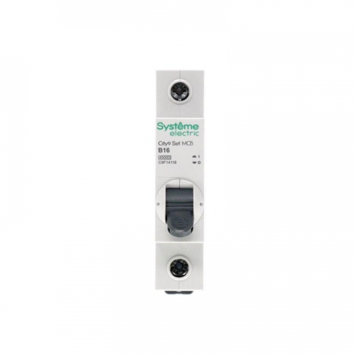 Автоматический выключатель серии City9 Set Systeme Electric, 1-полюсный, номинальный ток 16 А, характеристика B, Icn = 4.5 кА. Применяется в электрических сетях напряжением 230 В. Предназначен для защиты от перегрузок и токов короткого замыкания. Оснащен механизмом «мгновенной коммутации». Ударопрочный корпус из специального пластика с 6 металлическими заклепками. Безопасные клеммы исключают попадание кабелей в заклеммное пространство (ранее Schneider Electric EZ9F14116).