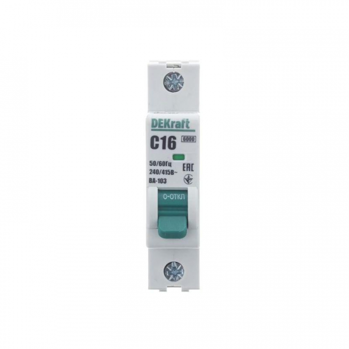 Автоматический выключатель серии ВА-103 NEW Dekraft; 1P; номинальный ток 16 А; характеристика C; отключающая способность 6 кА, что позволяет использовать аппараты в качестве вводных. 5 монолитных заклепок повышают прочность корпуса аппарата. Окошко-индикатор всегда показывает состояние контактов вне зависимости от положения рукоятки управления. Боковые каналы охлаждения повышают стабильность работы при высоких температурах окружающей среды. Есть возможность установки дополнительных аксессуаров с левой стороны устройства. Аппарат на 100% совместим с корпусами и оболочками Dekraft, Systeme Electric.