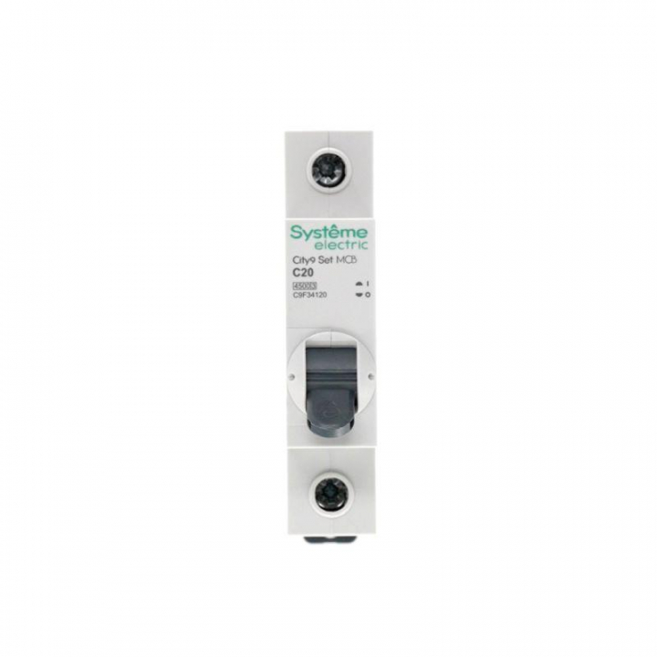 Автоматический выключатель серии City9 Set Systeme Electric, 1-полюсный, номинальный ток 20 А, характеристика С, Icn = 4.5 кА. Применяется в электрических сетях напряжением 230 В. Предназначен для защиты от перегрузок и токов короткого замыкания. Оснащен механизмом «мгновенной коммутации». Ударопрочный корпус из специального пластика с 6 металлическими заклепками. Безопасные клеммы исключают попадание кабелей в заклеммное пространство (ранее Schneider Electric EZ9F34120).