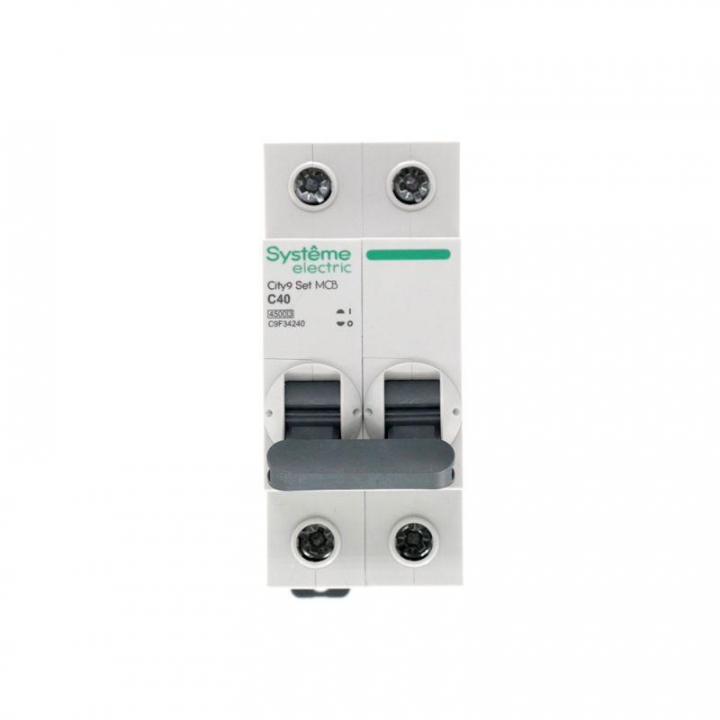 Автоматический выключатель серии City9 Set Systeme Electric, 2-полюсный, номинальный ток 40 А, характеристика С, Icn = 4.5 кА. Применяется в электрических сетях напряжением 230 В. Предназначен для защиты от перегрузок и токов короткого замыкания. Оснащен механизмом «мгновенной коммутации». Ударопрочный корпус из специального пластика с 6 металлическими заклепками. Безопасные клеммы исключают попадание кабелей в заклеммное пространство (ранее Schneider Electric EZ9F34240).