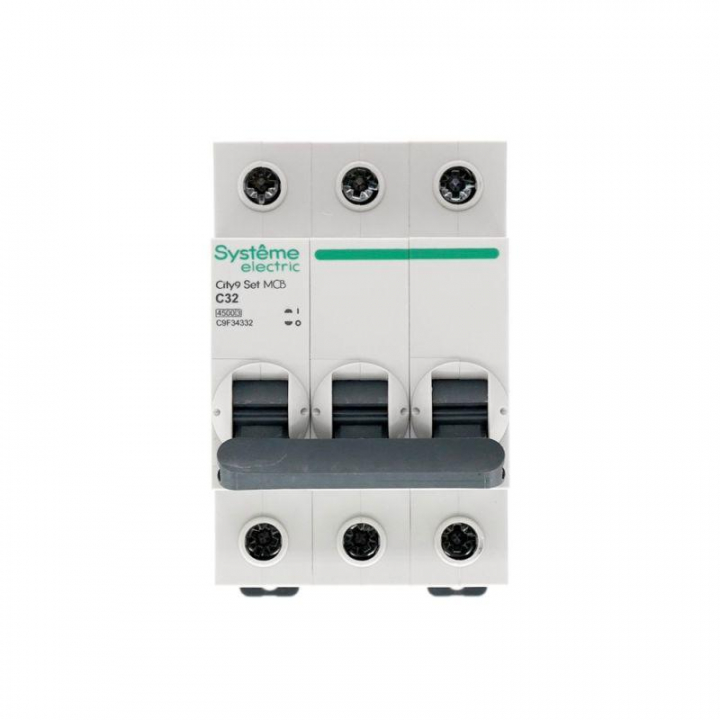 Автоматический выключатель серии City9 Set Systeme Electric, 3-полюсный, номинальный ток 32 А, характеристика С, Icn = 4.5 кА. Применяется в электрических сетях напряжением 400 В. Предназначен для защиты от перегрузок и токов короткого замыкания. Оснащен механизмом «мгновенной коммутации». Ударопрочный корпус из специального пластика с 6 металлическими заклепками. Безопасные клеммы исключают попадание кабелей в заклеммное пространство (ранее Schneider Electric EZ9F34332).