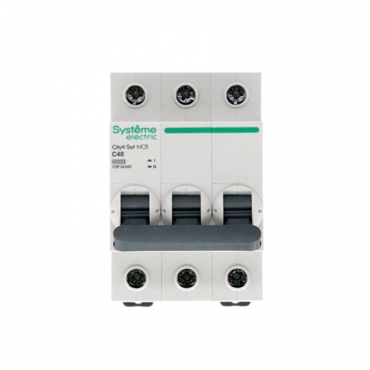 Автоматический выключатель серии City9 Set Systeme Electric, 3-полюсный, номинальный ток 40 А, характеристика С, Icn = 4.5 кА. Применяется в электрических сетях напряжением 400 В. Предназначен для защиты от перегрузок и токов короткого замыкания. Оснащен механизмом «мгновенной коммутации». Ударопрочный корпус из специального пластика с 6 металлическими заклепками. Безопасные клеммы исключают попадание кабелей в заклеммное пространство (ранее Schneider Electric EZ9F34340).
