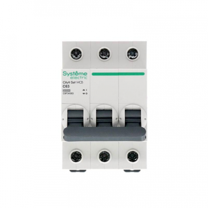 Автоматический выключатель серии City9 Set Systeme Electric, 3-полюсный, номинальный ток 63 А, характеристика С, Icn = 4.5 кА. Применяется в электрических сетях напряжением 400 В. Предназначен для защиты от перегрузок и токов короткого замыкания. Оснащен механизмом «мгновенной коммутации». Ударопрочный корпус из специального пластика с 6 металлическими заклепками. Безопасные клеммы исключают попадание кабелей в заклеммное пространство (ранее Schneider Electric EZ9F34363).