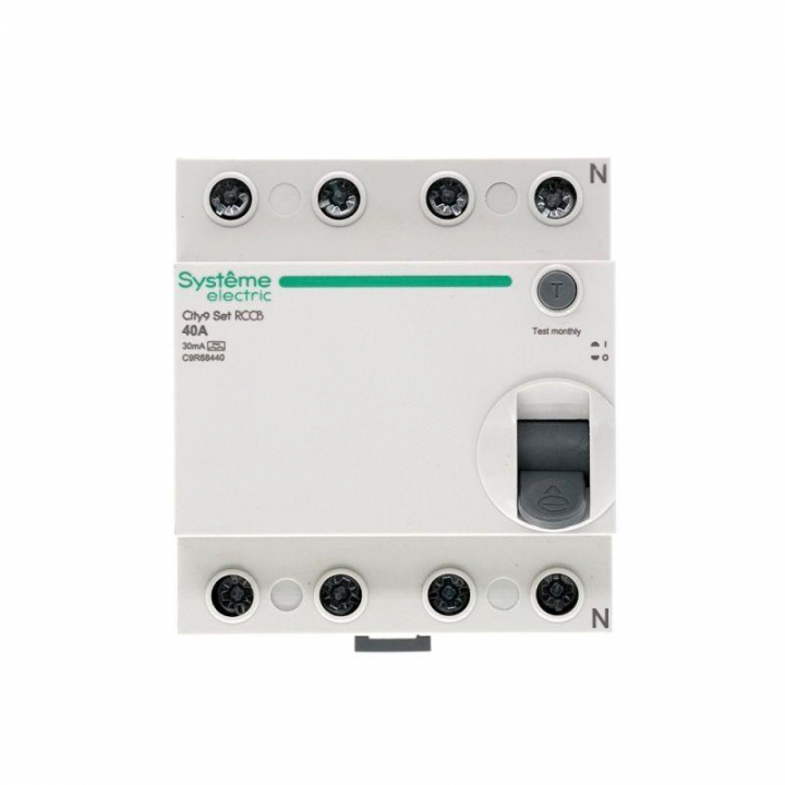 Выключатель дифференциального тока (ВДТ) или устройство защитного отключения (УЗО) серии City9 Set Systeme Electric, 4-полюсный, номинальный ток 40А, ток утечки 30 мА, тип А, электромеханический. Применяется в электрических сетях напряжением 400В. Уставка по току утечки 30 мА обеспечивает гарантированную защиту людей при прямом и косвенном прикосновении. Кнопка тест обеспечивает проверку работоспособности аппарата. Крепление на DIN-рейку шириной 35 мм. Подключение сверху и снизу. Безопасные клеммы.