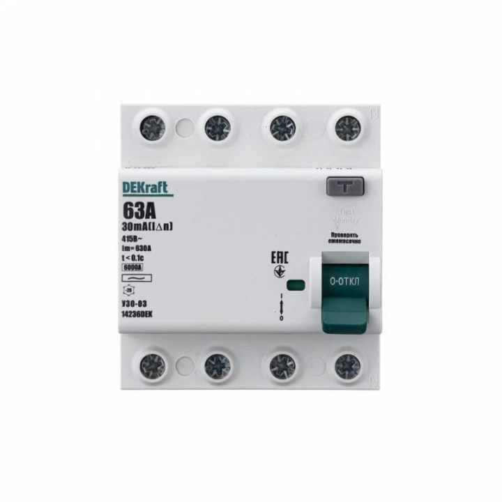 Выключатель дифференциального тока серии УЗО-03 Dekraft; 4P; номинальный ток 63 А; ном.дифф. ток 30 мА; электромеханический; тип дифференциального расцепителя - AC; на DIN-рейку. ВДТ устанавливаются в сетях напряжением до 400 В пер.тока. ВДТ применяются для защиты электроустановок от риска возникновения пожаров вследствие утечек тока. Конструкция устройств позволяет эксплуатировать их даже при низкой температуре. При сборке выключатель дифференциального тока (ВДТ) и автоматический выключатель (для защиты ВДТ) устанавливаются последовательно, при этом номинальный ток аппарата должен быть на одну ступень выше — т. е. 20А при установке последовательно с автоматом на 16А, 32А при установке с автоматом на 25А.