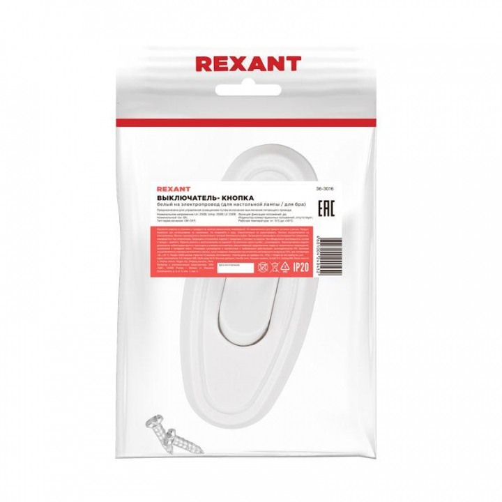Выключатель-кнопка 6А 250ВON-OFF на электропровод для настольной лампы/бра бел. Rexant 36-3016