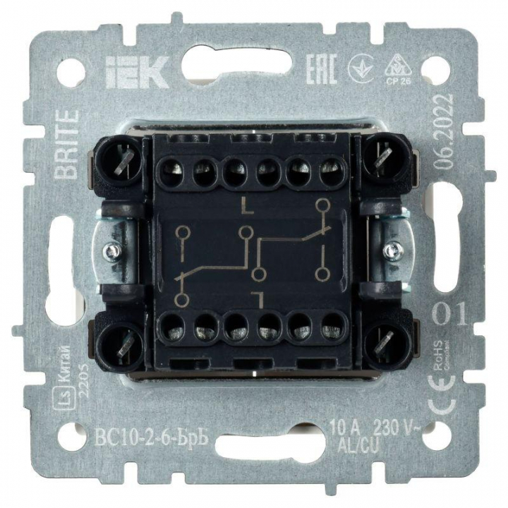Выключатель проходной 2-кл. СП BRITE ВС10-2-6-БрБ 10А механизм бел. IEK BR-V22-0-10-K01